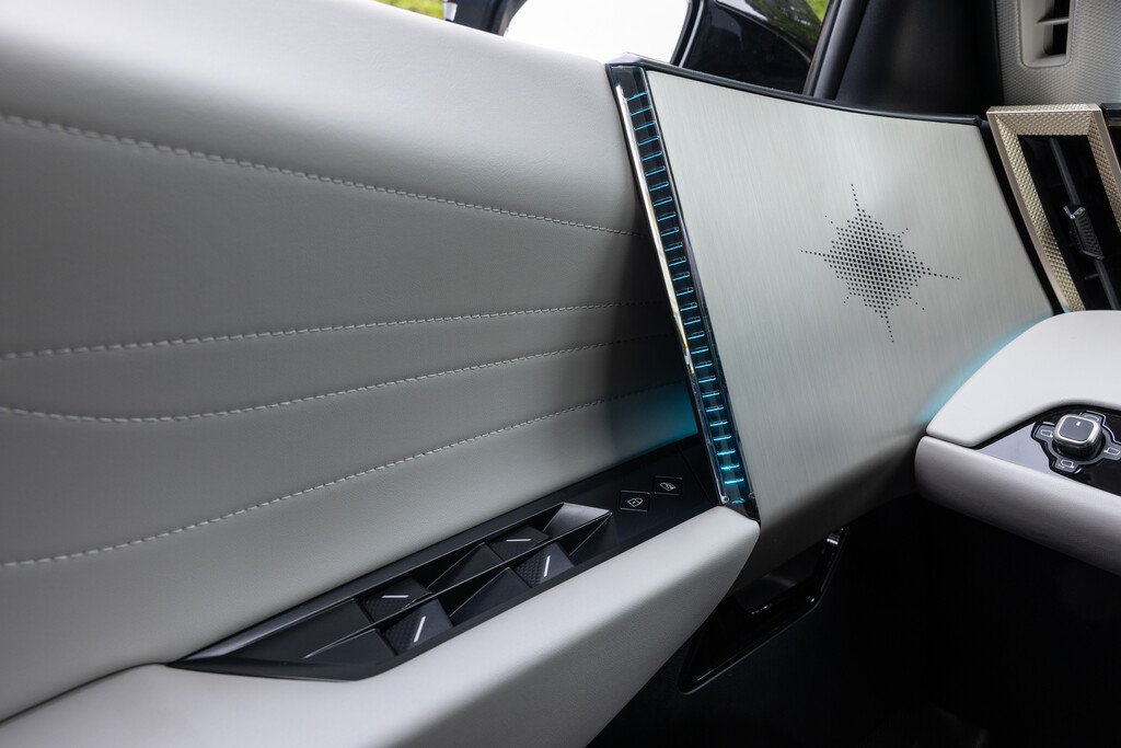 Die breite Mittelkonsole trennt Fahrer und Beifahrer und ist solide strukturiert. Statt Touchscreen-Tyrannei gibt es viele echte Tasten. Die Menüführung auf dem schmalen, 16 Zoll großen Zentraldisplay ist klar, der Bildschirm farblich individualisierbar, ein Head-up-Display projiziert Fahrerinformationen direkt auf die Scheibe, das 10,25-Zoll-Instrumentendisplay zeigt klassisch-modern Geschwindigkeit, Akkustand und Navigation. Allein das vierspeichige, doppelt abgeflachte Lenkrad-Design in X-Form mag originell wirken, überzeugt in der Handhabung aber weniger. Und auch die Bedienelemente, wie die Spiegelverstellung tief unten am Armaturenbrett, zeugen mehr von gestalterischem Willen als von ergonomischem Feinsinn.