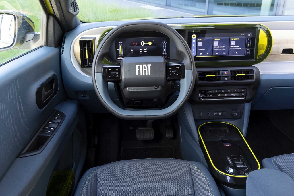 Die kantige Form hat nichts von ihrem sympathischen Erscheinungsbild verloren, der Grande ist ein Hingucker und manch einer an der Ampel hebt die Hand zum Gruß, lächelt und erinnert sich vielleicht an jugendliche Automobil-Erfahrungen. Dass er sich die Basis mit dem C3 von Citroën teilt, fällt aus keinem Betrachtungswinkel auf. Auch im Inneren zitieren die Designer den Großvater. Die Displays werden von ovalen Rahmen geziert, die sollen an die historische Einfahrstrecke auf dem Dach der früheren Fiat-Zentrale Lingotto in Turin erinnern. Das Handschuhfach wird aus Bambusfaser gefertigt, Luftausströmer setzen farblich Kontrastpunkte. Die Sitze vorn sind höhenverstellbar und hinreichend bequem, auf der Rückbank finden zwei Passagiere gute Plätze, wenn die Menschen vorn ihre Sessel nicht bis in die hinterste Stellung schieben.