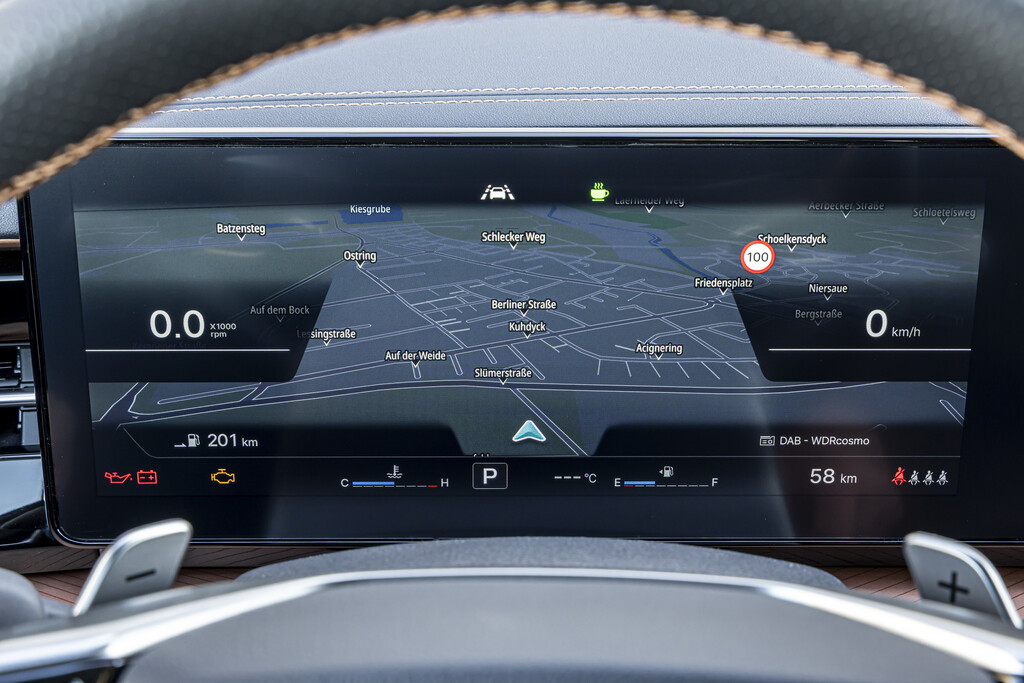 Dafür sind die Schaltflächen groß genug, um sie auch während der Fahrt zu treffen, die Bedienung intuitiv, die Menüs flach strukturiert. Das Digitalcockpit mit 12,5 Zoll ist übersichtlich, der zentrale Bildschirm tut, was er soll. Auch die ergonomische Orientierung zum Fahrer hin wirkt durchdacht. Wer allerdings klassische Dreh- oder Kippschalter erwartet, wird enttäuscht – auch hier muss man sich mit Touchfeldern arrangieren.