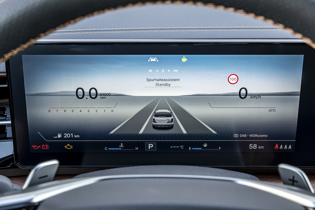 Im Cockpit fällt der Blick direkt auf das Lenkrad – ein ovales Kunstwerk aus Kunstleder, Klavierlack, grauem Kunststoff und etwas chromfarbenem Plastik. Eine Komposition, die den Eindruck erweckt, als hätten sich die Designer nicht auf ein Konzept einigen können. Etwas weniger wäre hier mehr gewesen. Dafür bietet der Innenraum viel Luft über und insgesamt ein Raumgefühl, das an größere Klassen erinnert. Die Sitze sind bequem, die Polster großzügig, die Verarbeitung ordentlich. Sogar ein Hauch von Luxus liegt in der Luft, jedenfalls bis man genauer hinsieht: Die Multimedia-Ausstattung wirkt mit ihren groben Grafiken eher retro als modern. Drei Bildschirme sind es immerhin – zwei davon Touchscreens, einer für die Klimaautomatik. Audi lässt grüßen, auch wenn die koreanische Umsetzung nicht ganz so filigran daherkommt.