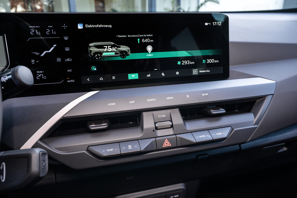 Überhaupt herrscht im Innenraum Funktionalität mit Wohlfühlanspruch. Das Cockpit wirkt aufgeräumt, die bekannte durchgehende Displaylandschaft, bestehend aus zwei 12,3-Zoll-Bildschirmen für Kombiinstrument und Infotainment sowie einem 5,3 Zoll großen Screen für die Klimasteuerung dazwischen, ist logisch integriert und intuitiv bedienbar. Für die Standardfunktionen gibt es darüber hinaus zahlreiche analoge Tasten. Materialien und Verarbeitung machen einen soliden Eindruck. Was man anfasst, fühlt sich gut an, im unteren Bereich kommt allerdings auch harter Kunststoff zum Einsatz. Die Sitze sind klar auf Langstreckenkomfort ausgelegt, in der GT-Line sorgt ein Massagesitz für zusätzliche Entspannung.