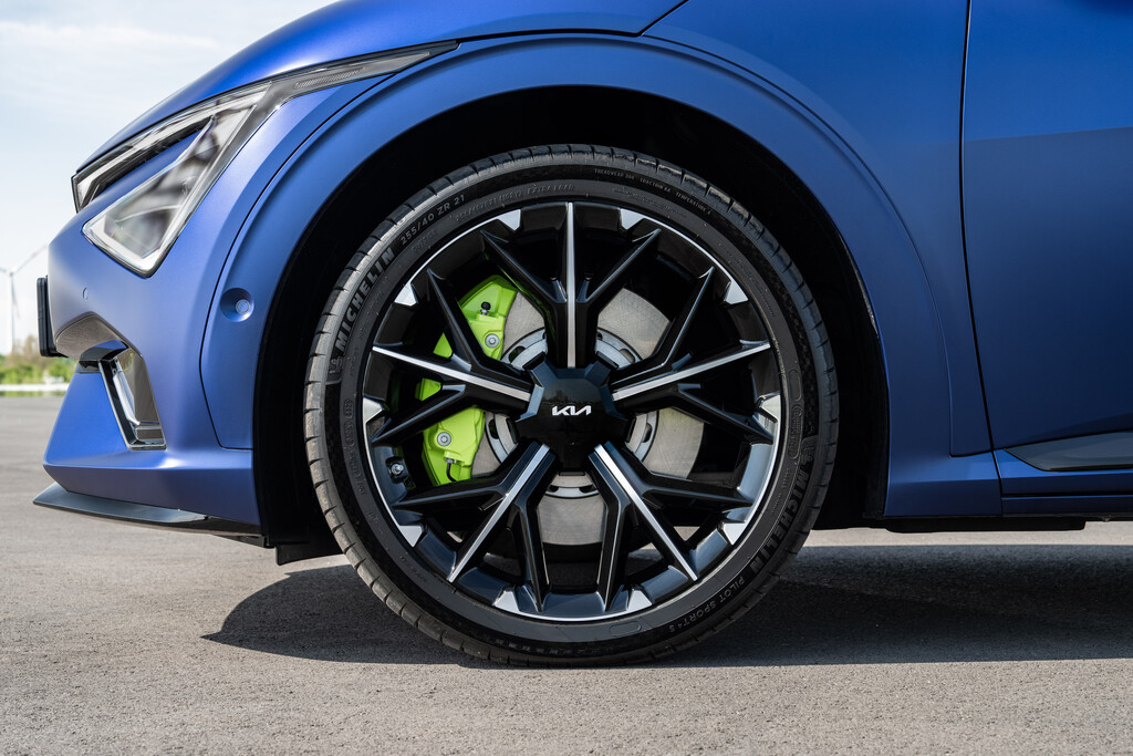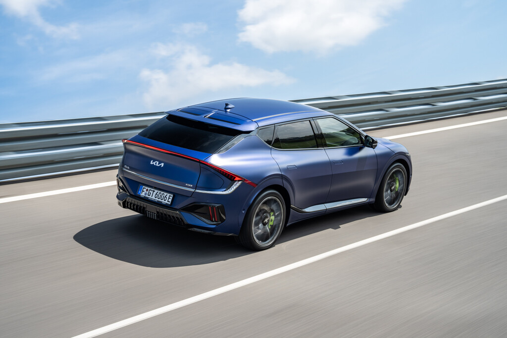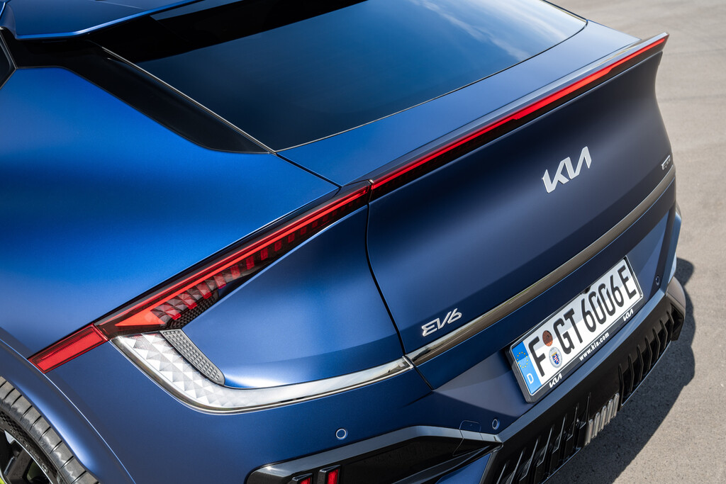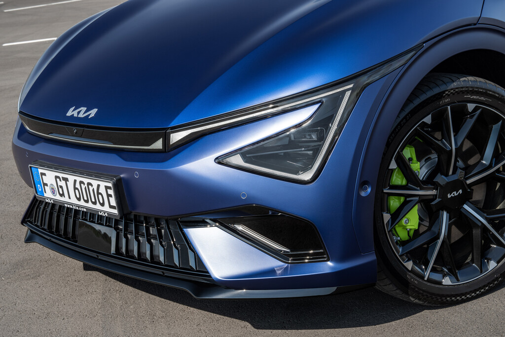 Ein überarbeiteter Heckspoiler, dynamischer gestaltete Stoßfänger sowie ein frisches Design für die 21-Zoll-Felgen runden den optischen Auftritt ab. Bei den dahinter liegenden Bremssätteln bleibt es hingegen bei der auffällig neongrünen Lackierung, die innerhalb der EV6-Baureihe exklusiv für den GT angeboten wird. Apropos Farben: Metallic- oder Perleffekt-Lackierungen an der Karosserie zählen nun zum serienmäßigen Lieferumfang. Einzig für das neu ins Programm aufgenommene „Yacht Blau Matt“ rufen die Koreaner 1800 Euro extra auf.