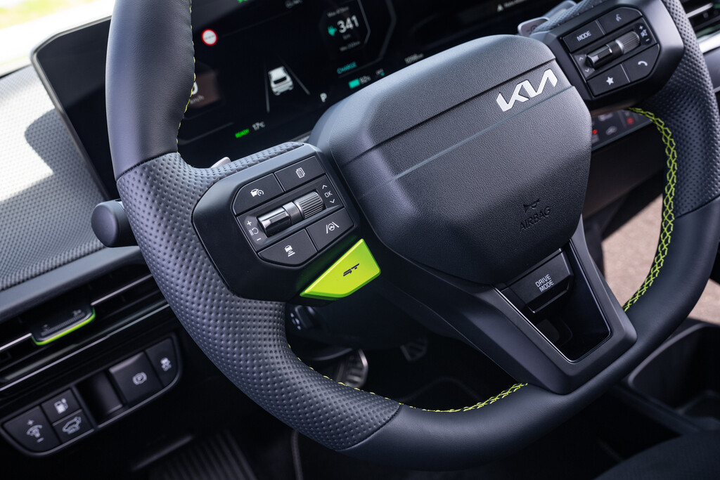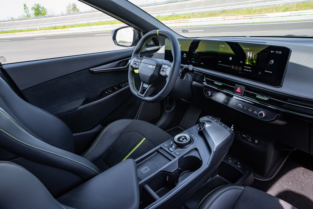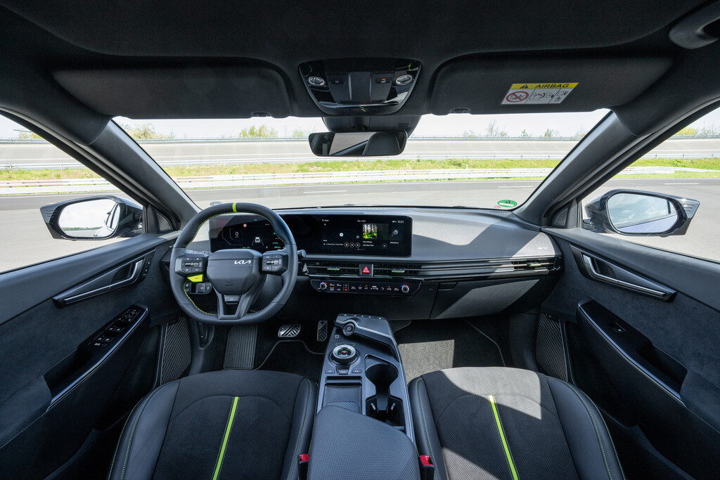 Auch im Innenraum erhielt der EV6 GT eine Aufwertung. Das neu gestaltete Sportlenkrad lässt sich jetzt elektrisch einstellen. Gleiches gilt für die konturierten Sportsitze vorn, die nicht nur beheizbar, sondern nun auch belüftet sind und über eine Memory-Funktion für den Fahrer verfügen. Das Multimediasystem mit 12,3-Zoll-Touchscreen ist mit der neuesten Softwaregeneration ausgestattet und vernetzt Smartphones kabellos.