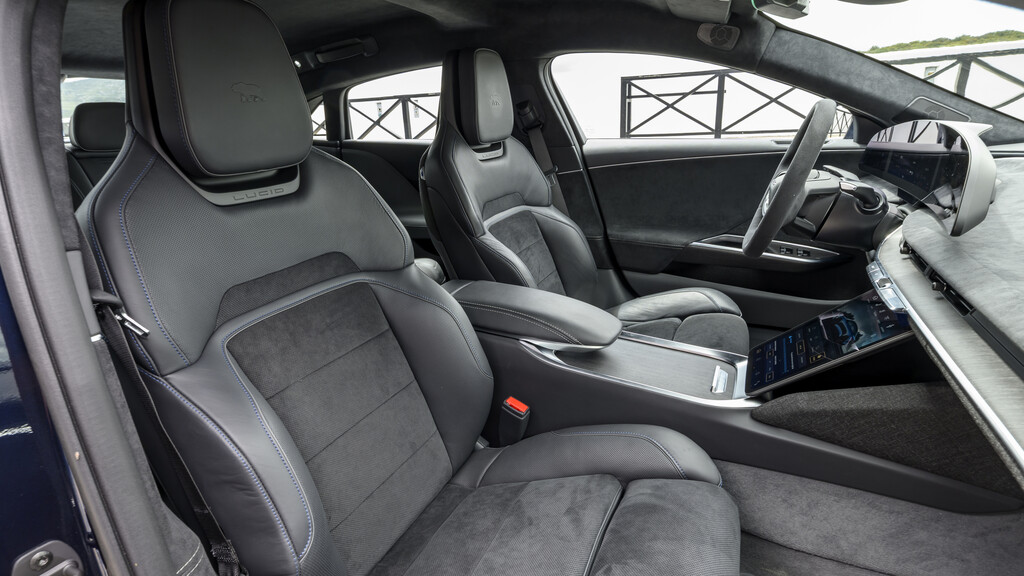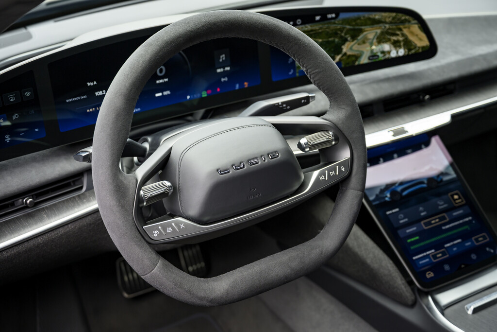 Das Interieur ist durch hochwertige Materialien wie Nappaleder und Alcantara geprägt. Eine Besonderheit ist die dreistufig verstellbare Kopfstütze, die speziell für den Rennstreckeneinsatz mit Helm konzipiert wurde – eine Innovation, die in dieser Form einzigartig ist. Der geräumige Innenraum mit großzügiger Beinfreiheit und einem großen Kofferraum inklusive eines voluminösen „Frunk“ unterstreicht die Vielseitigkeit und Alltagstauglichkeit des Lucid. Gerade im Vergleich mit dem Porsche Taycan oder mit dem Audi e-Tron GT punktet der Sapphire mit einer viel effizienteren Raumausnutzung.