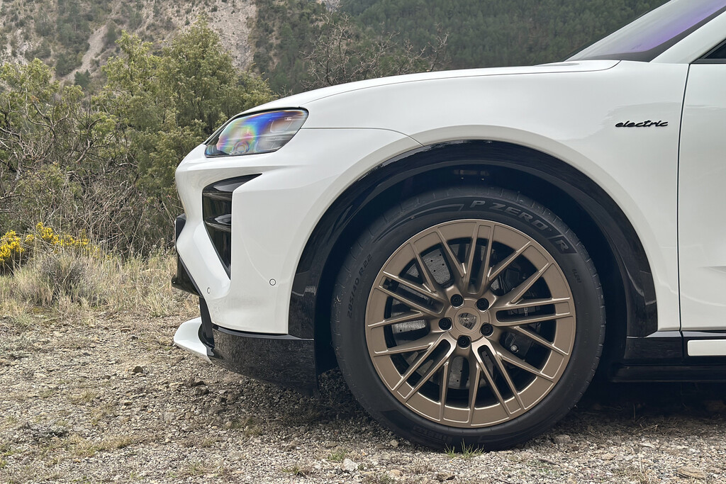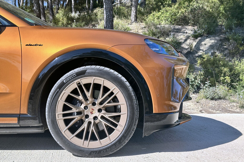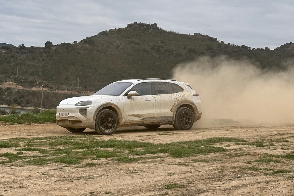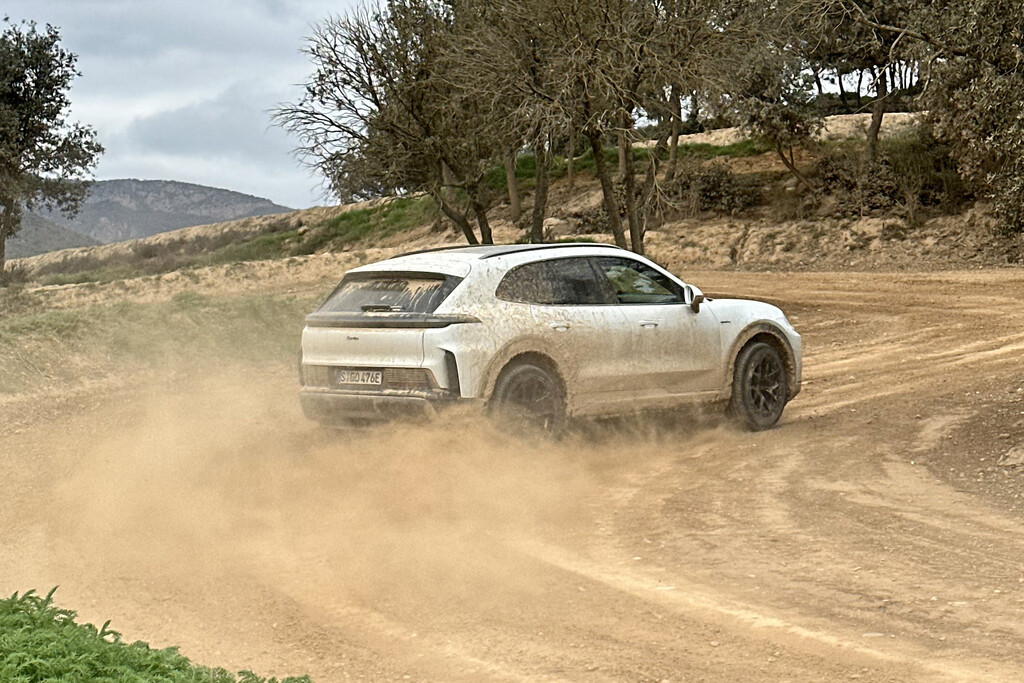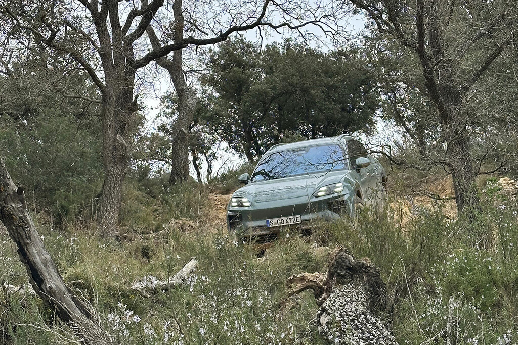 Die Offroad-Fähigkeiten des elektrischen Cayenne übertrafen unsere Erwartungen deutlich. Traktion und Achsenverschränkung sind geländetauglich, und der Böschungswinkel verbessert sich mit dem knapp 3000 Euro teuren, optionalen Offroad-Paket, das in der Preisliste neben anderen Designpaketen unter Exterieur subsumiert ist. Es lässt sich überraschenderweise nur mit 21- oder 22-Zoll-Rädern kombinieren, die im anspruchsvollen Gelände vermutlich noch empfindlicher als die serienmäßigen 20-Zoll-Räder sind.