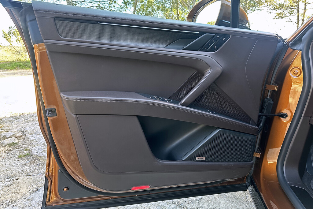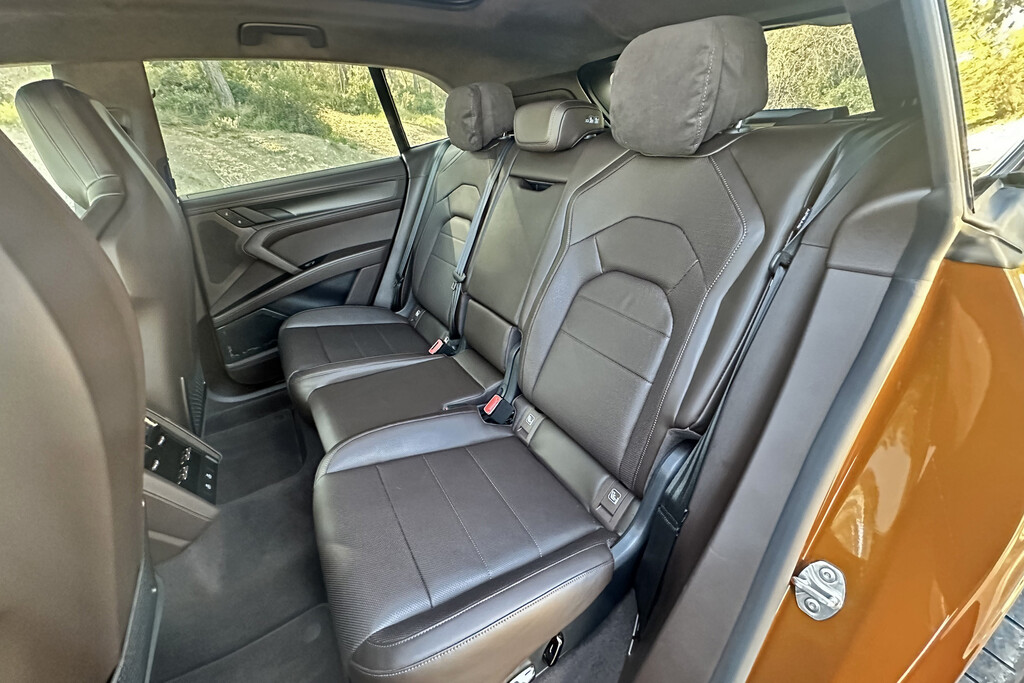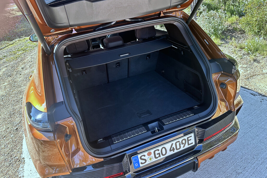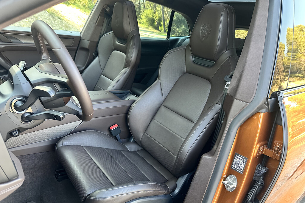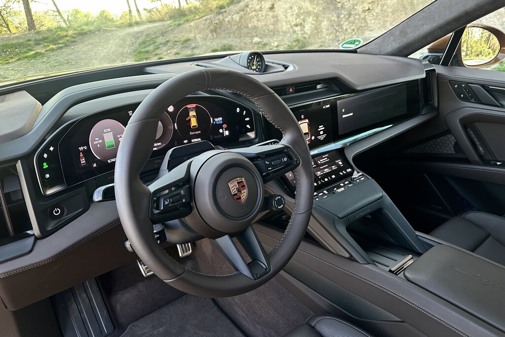 Beim Einstieg fällt sofort auf, wie tief man im Wagen sitzt: Satte sieben Zentimeter tiefer als im Verbrenner. Kein Offroader-Gefühl, sondern eine sportliche Sitzposition, näher an der Limousine Panamera als an einem Geländewagen. Die optionalen Sportsitze verstärken dieses Gefühl; der Seitenhalt der Wangen ist perfekt, man sitzt fest und präzise.