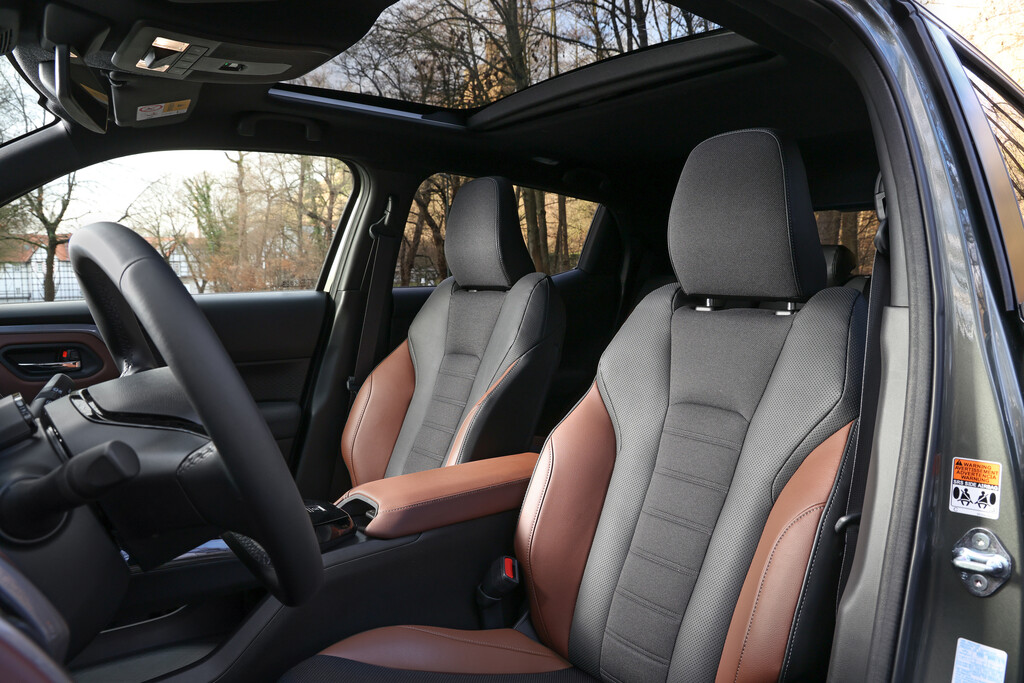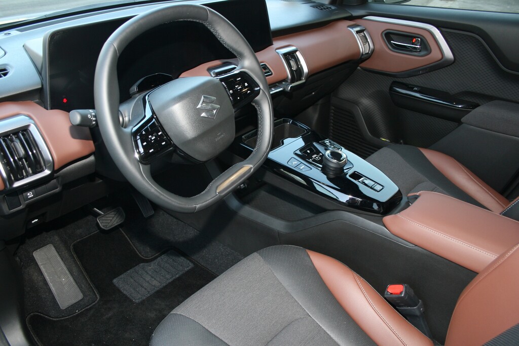Das Ambiente, insbesondere in der zweifarbigen Ausführung, ist einladend. Das 10,25 Zoll große digitale Kombiinstrument und der 10,1-Zoll-Bedientouchscreen sind zu einer Einheit zusammengefasst und bieten jeweils auch die Möglichkeit eines dreifach geteilten Bildschirms (vor dem Fahrer mit runden Ausschnitten links und rechts). Eine induktive Ladeschale sowie jeweils ein Mini-USB- und USB-C-Anschluss vorne und hinten sorgen für die nötige Smartphoneeinbindung. Das Navigationssystem wird über Android-Auto oder Apple-Carplay gesteuert. Die Kommandazentrale in der Mittelkonsole überspannt das Ablagefach und reicht den Drehschalter und die Tasten für die primären Fahrfunktionen übersichtlich und gut erreichbar dar. Klimatisierung, Belüftung und die Scheibenheizung lassen sich wahlweise statt über den Touchscreen auch direkt über sechs Wipptasten regeln. Für die Lautstärkeregelung gibt es ebenfalls bei Bedarf noch einen klassischen Drehknopf. Die Assistenzsysteme werden wie gewohnt vom Lenkrad aus bedient, nur die dreistufige Rekuperationseinstellung versteckt sich im Menü des Bordcomputers, wobei der e-Vitara kein One-Pedal-Niveau erklimmt.