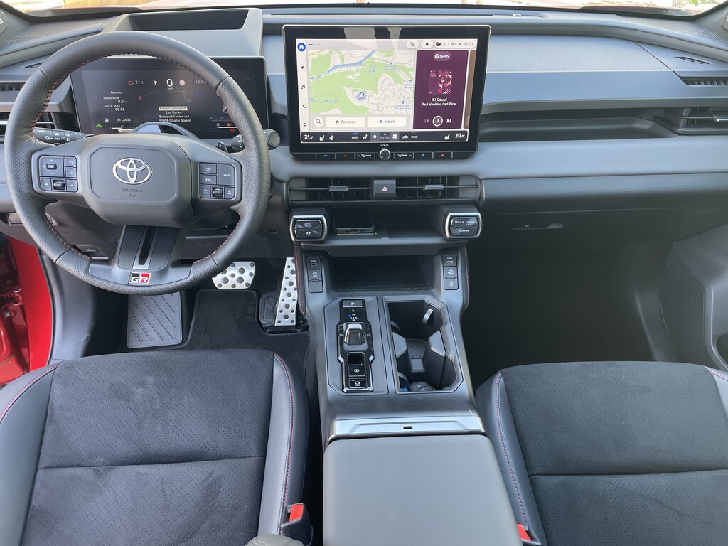 Im Innenraum setzt Toyota weiterhin auf eine robuste, fast handwerkliche Ästhetik. Das Cockpit bleibt solide, kantig, funktional – bewusst fern von futuristischem Minimalismus. Alles ist klar strukturiert, mit einer Mischung aus Hartplastik und weicheren Oberflächen, die sich im Alltag bewährt. Die neue frei schwebende 12,3 Zoll-Instrumententafel ist gut durch das Lenkrad einsehbar und mit ihren klaren Grafiken auch leicht ablesbar. Wer mag, konfiguriert sich das Layout nach eigenem Geschmack. Der zentrale, leicht zurück versetzte 12,9 Zoll-Touchscreen fügt sich harmonisch in die Instrumentenlandschaft ein, was optisch Ruhe schafft. Neu ist die Infotainment-Architektur. Toyota setzt auf das so genannte Arene-System, das deutlich flüssiger, intuitiver und moderner wirkt als frühere Versionen. Sprachsteuerung, Over-the-air-Updates, Smartphone-Integration, alles da, ohne Anspruch, ein rollendes Smartphone zu sein.