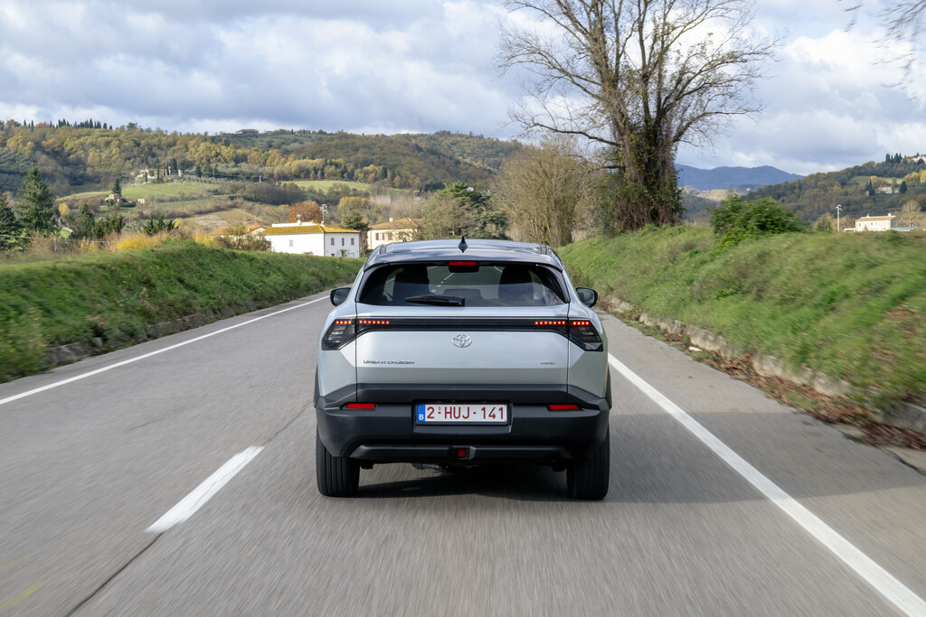 Und tatsächlich wird der Urban Cruiser in der Stadt zum stillen Gleiter. Der kräftigere Frontantrieb mit 128 kW schiebt souverän an, ohne Aggression, aber mit ausreichend Punch, um zügig mitzuschwimmen. In flotten 8,7 Sekunden beschleunigt er auf Tempo 100. Nochmal knapp anderthalb Sekunden schneller ist die Allradvariante. Wer regelmäßig mehr als Kiesparkplatz und Waldweg befährt, ist mit dem zusätzlichen 48-kW-Heckmotor besser bedient. Toyota selbst erwartet dennoch nur einen Mini-Anteil für den Allrad. So oder so, schneller als 150 km/h fahren sie beide nicht.