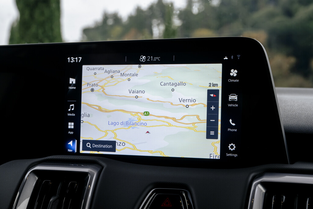 Denn auch im Cockpit wirkt der Wagen nicht ganz taufrisch. Der Fahrer schaut auf ein 10,25-Zoll-Kombiinstrument, das in der Mitte von einem 10,1-Zoll-Touchscreen ergänzt wird, deren Darstellung jedoch etwas aus der Zeit gefallen wirkt. Dafür ist das Menü weitgehend logisch und die wichtigsten Funktionen liegen nicht drei Ebenen tief versteckt. Klimaanlage, Temperatur und Luftstrom werden klassisch per Tasten geregelt, die Sitzheizung ist dagegen an den Touchscreen ausgelagert, als handle es sich um eine selten benötigte Spezialfunktion. Auch die Smartphone-Integration gelingt mühelos, Apple CarPlay und Android Auto laufen kabellos, USB-Anschlüsse gibt es für vorne und hinten. Ein Reinfall auf unseren Testfahrten war jedoch das Navigationssystem, dessen Arbeitstempo eher an Amtsstube als an Glasfaser erinnert. Mancher Abbiegehinweis kam erst, nachdem die Kurve bereist passiert war und auch hier hat die Grafik etwas von früher Konsolengeneration.