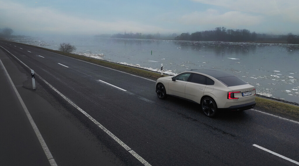 Die optional erhältliche Luftfederung in der Ultra-Ausstattung bügelt kurze Stöße und lange Wellen angenehm glatt, im härteren Modus bleibt genug Kontrolle, ohne den Komfortanspruch zu verraten. Unterstützt wird das von einem sehr leisen Innenraum, Windgeräusche sind kaum ein Thema und das Abrollen verschwindet meist im Hintergrund. Entsprechend offenbart sich sein wahrer Charakter auf Landstraße und Autobahn. Die tempoabhängige Lenkung arbeitet leichtgängig, manchem Fahrer vielleicht einen Tick zu leicht, was den sportlichen Zugriff etwas filtert, aber gut zum entspannten Gesamtcharakter passt. Im strafferen Modus wird das Feedback spürbar direkter, ohne dass der ES90 zum Kurvenräuber mutiert. Auf winterlich verschneiten Nebenstrecken bleibt die Limousine lange gutmütig; selbst wenn das Heck auf Eis und Neuschnee hie und da leicht versetzt, lässt sie sich sauber einfangen, unterstützt von fein regelnden Regelsystemen.