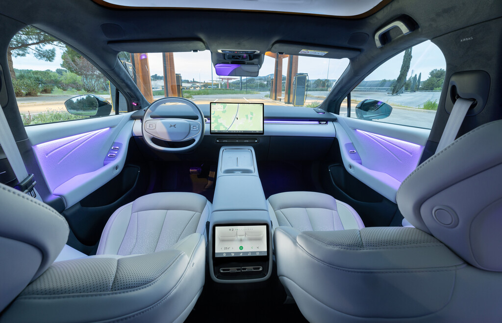 Im Cockpit herrscht der inzwischen etablierte Digital-Minimalismus. Ein 15,6 Zoll großer Touchscreen in der Mitte übernimmt fast alle zentralen Funktionen, dazu kommen ein sehr schmales 8,8-Zoll-Display hinter dem Lenkrad sowie erstmals ein großes Head-up-Display, das serienmäßig eingebaut ist. Letzteres ist ein Gewinn, weil alle relevanten Informationen direkt im Sichtfeld auftauchen. Manchmal allerdings auch zu viele, wenn an wuseligen Kreuzungen jedes Gefährt vor und neben dem Auto schematisch angezeigt wird. Auch bei Konnektivität und Komfortausstattung geizt Xpeng nicht. Apple CarPlay und Android Auto funktionieren kabellos, zwei Smartphones lassen sich induktiv laden, und die Serienausstattung fällt selbst in der Basis bemerkenswert komplett aus. Sitzheizung, Sitzlüftung, Massage, Panorama-Glasdach, Assistenzpaket, Sprachsteuerung – alles nicht als teure Verlockung im Konfigurator versteckt, sondern weitgehend schon serienmäßig an Bord.