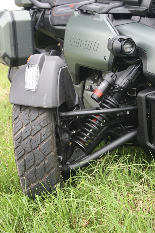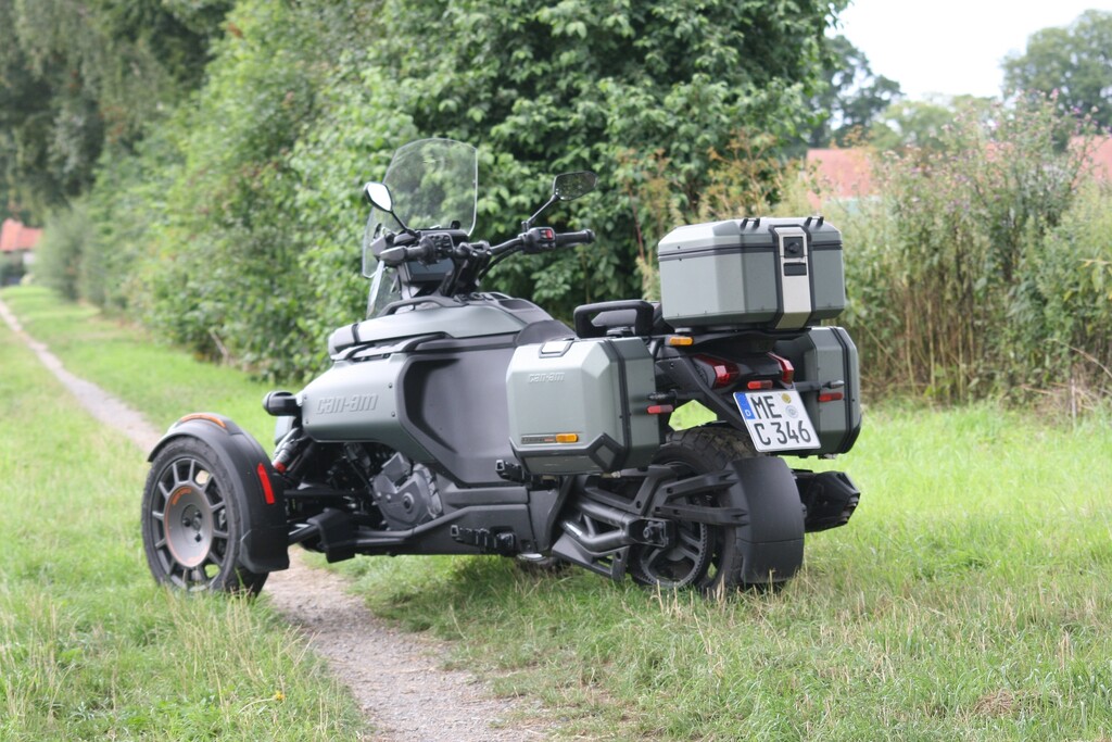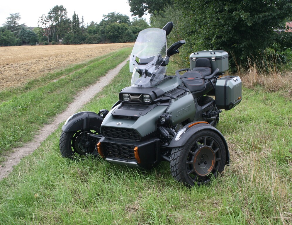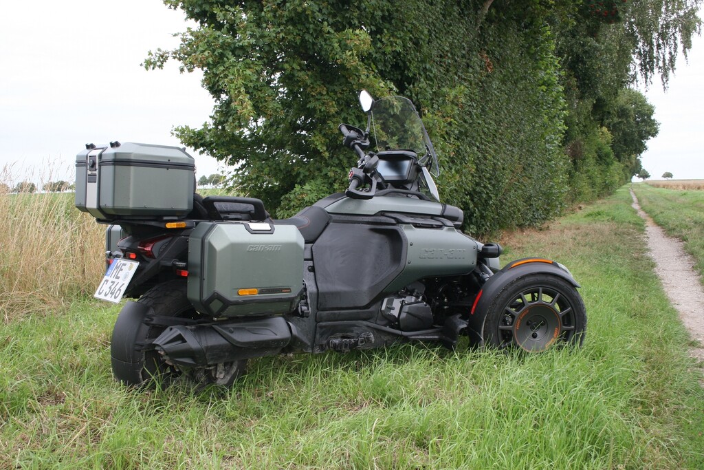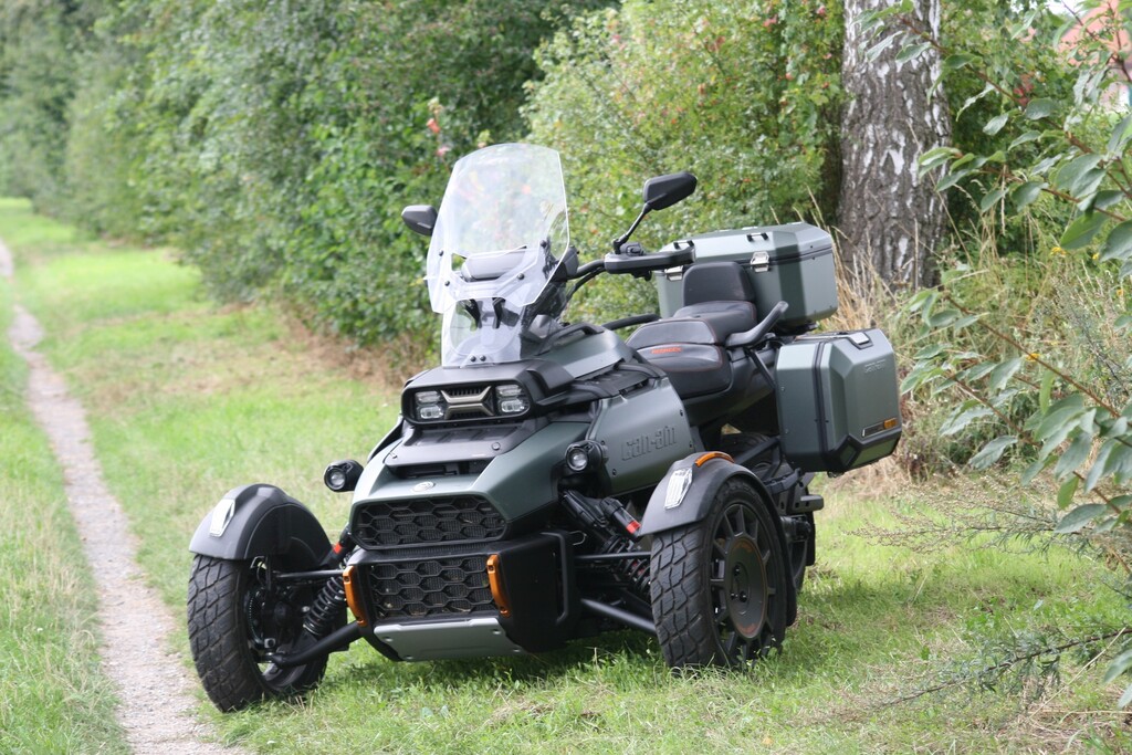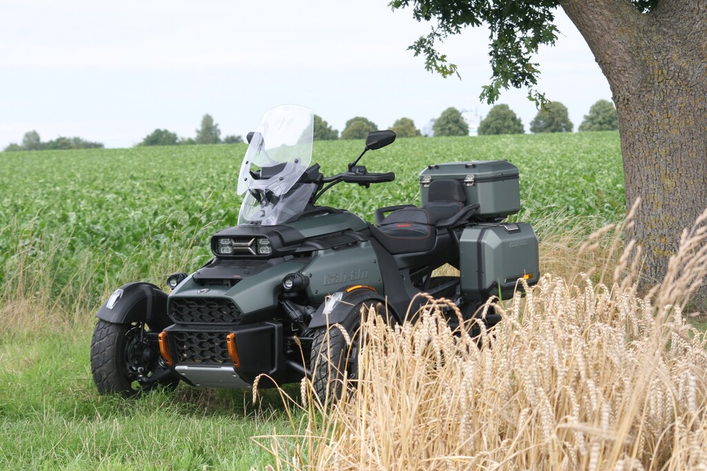 Mit 26 Zentimetern vorne respektive 23,5 Zentimetern hinten fast doppelt so viel Federweg wie der Spyder und 16- statt 15-Zoll-Vorderrädern mit etwas gröberem Profil sowie 39 Prozent mehr Bodenfreiheit (16 Zentimeter) darf der Untergrund für den Neuzugang durchaus gröberer Natur sein. Zum echten Geländegänger fehlt es dem Canyon am Ende zwar etwas an Bodenfreiheit und noch grobstolligeren Reifen als den Kenda XPS Adventure. Gleichwohl, sollte es auf Weltreise gehen, dürfte er die erste Wahl im Dreirad-Trio von Can-Am sein. Feld-, Wald- und Wiesenwege meistert der Canyon jedenfalls souverän.