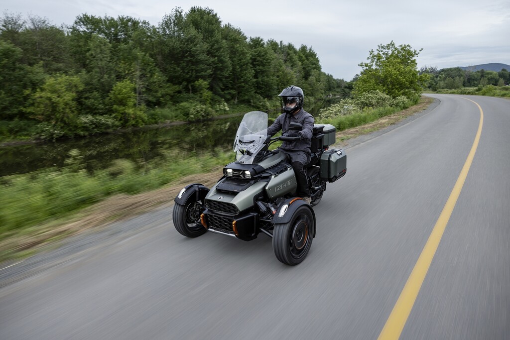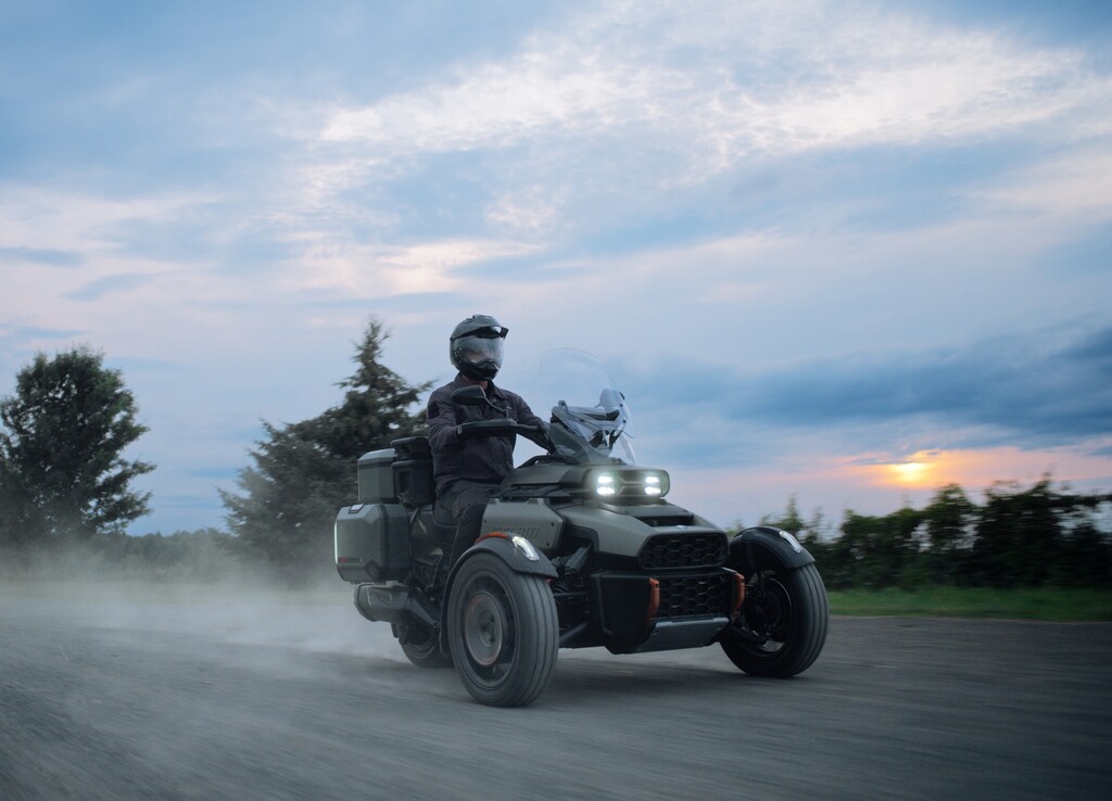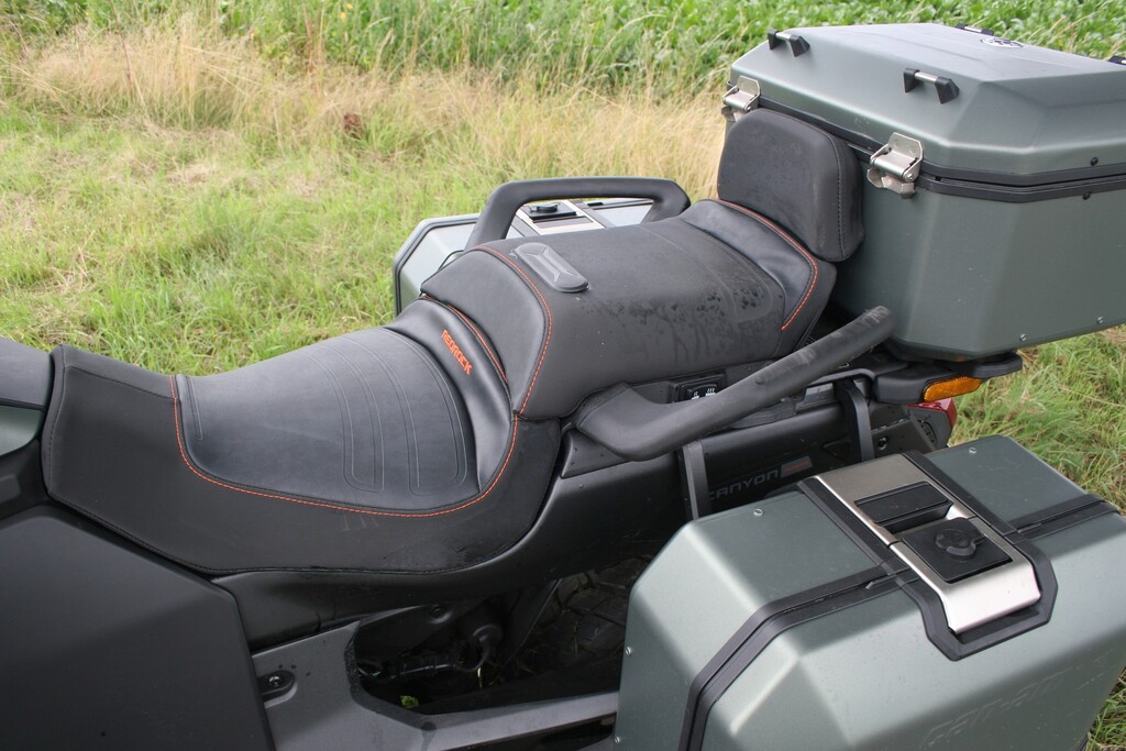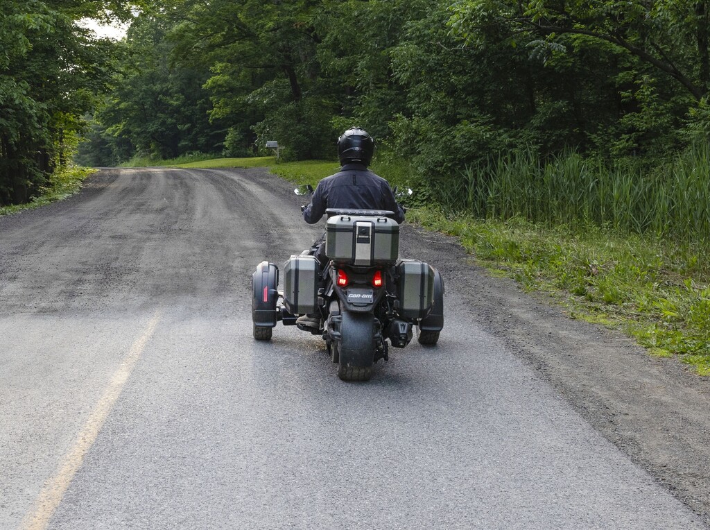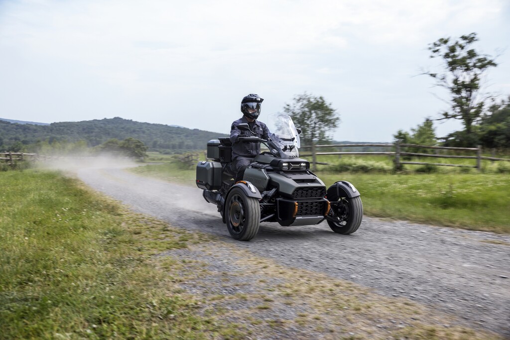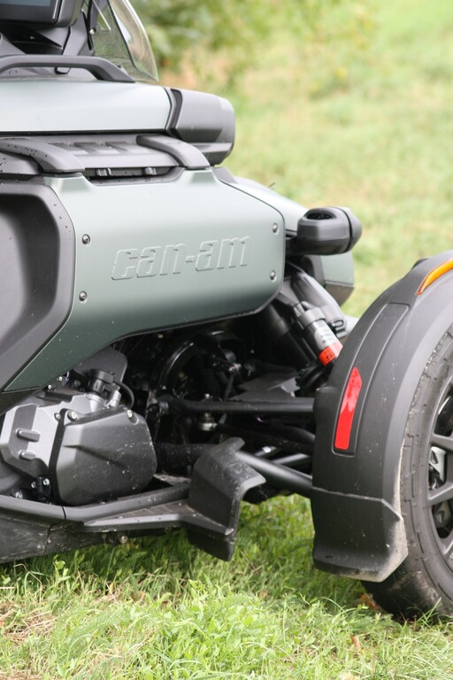 Mit 26 Zentimetern vorne respektive 23,5 Zentimetern hinten fast doppelt so viel Federweg wie der Spyder und 16- statt 15-Zoll-Vorderrädern mit etwas gröberem Profil sowie 39 Prozent mehr Bodenfreiheit (16 Zentimeter) darf der Untergrund für den Neuzugang durchaus gröberer Natur sein. Zum echten Geländegänger fehlt es dem Canyon am Ende zwar etwas an Bodenfreiheit und noch grobstolligeren Reifen als den Kenda XPS Adventure. Gleichwohl, sollte es auf Weltreise gehen, dürfte er die erste Wahl im Dreirad-Trio von Can-Am sein. Feld-, Wald- und Wiesenwege meistert der Canyon jedenfalls souverän.