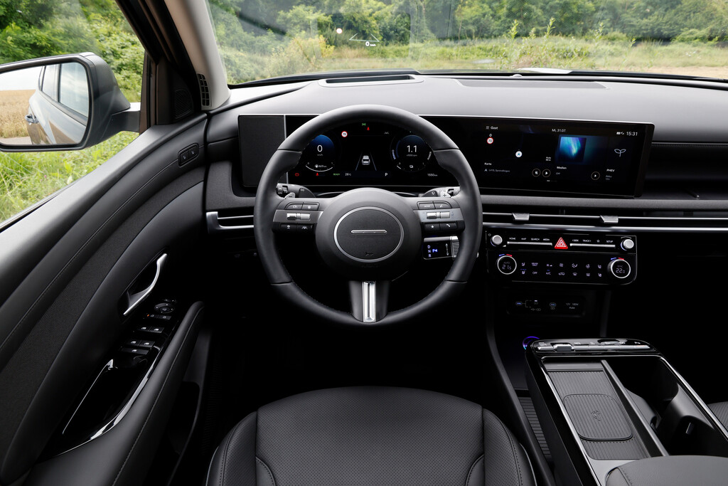 Glanzstück aber ist das Cockpit, das mit den integrierten Doppeldisplays Anleihen aus den Ioniq-Modellen zeigt. Die leicht geschwungene, horizontal ausgerichtete Anzeigentafel fügt sich elegant in die hochwertig anmutende Armaturenlandschaft ein. Hyundai widersteht dabei dem Tesla-Trend, alles in die Touchmenüs zu verbannen: Klima und Navigation lassen sich nach wie vor auch mit klassischen Tasten bedienen. Ein gelungenes Detail und große Hilfe beim Fahren ist das Head-up-Display, das die wichtigsten Infos direkt ins Blickfeld projiziert. Nicht mehr ganz neu, aber nach wie vor clever: Der Blinker aktiviert ein Kamerabild im Fahrerdisplay, das den toten Winkel live zeigt. Diese Funktion will man nach wenigen Kilometern nicht mehr missen – vor allem in der Stadt, beim Abbiegen und bei schlechten Sichtverhältnissen eine echte Erleichterung.