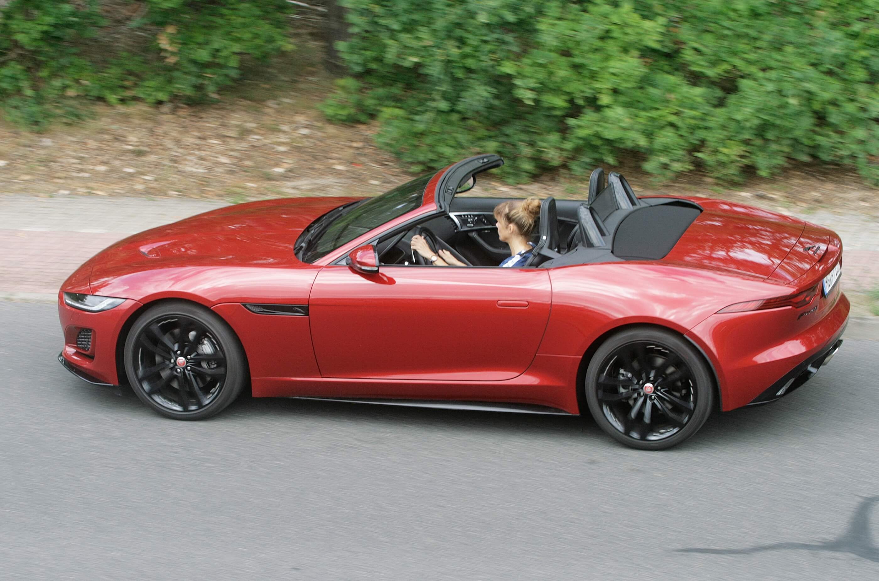 Der P300 stellt die Einstiegsversion in die Zweisitzer-Welt von Jaguar dar. Aus zwei Litern Hubraum holt es mittels Turbolader 300 muntere Pferdestärken und das maximale Drehmoment von ordentlichen 400 Newtonmetern liegt schon bei 1500 Umdrehungen an. Zum Vergleich: Der gleichstarke Porsche Boxster bringt es nur auf 380 Newtonmeter ab 2150 Umdrehungen. Dafür spurtet er dank seines um rund 200 Kilo geringeren Gewichts bis 275 km/h, während für den Jaguar bei 250 km/h Schluss ist. Wer unter dem Katzenlogo nach mehr Schmalz sucht, muss gleich zum V8-Motor greifen, denn der Sechszylinder wurde aus dem Programm gestrichen.