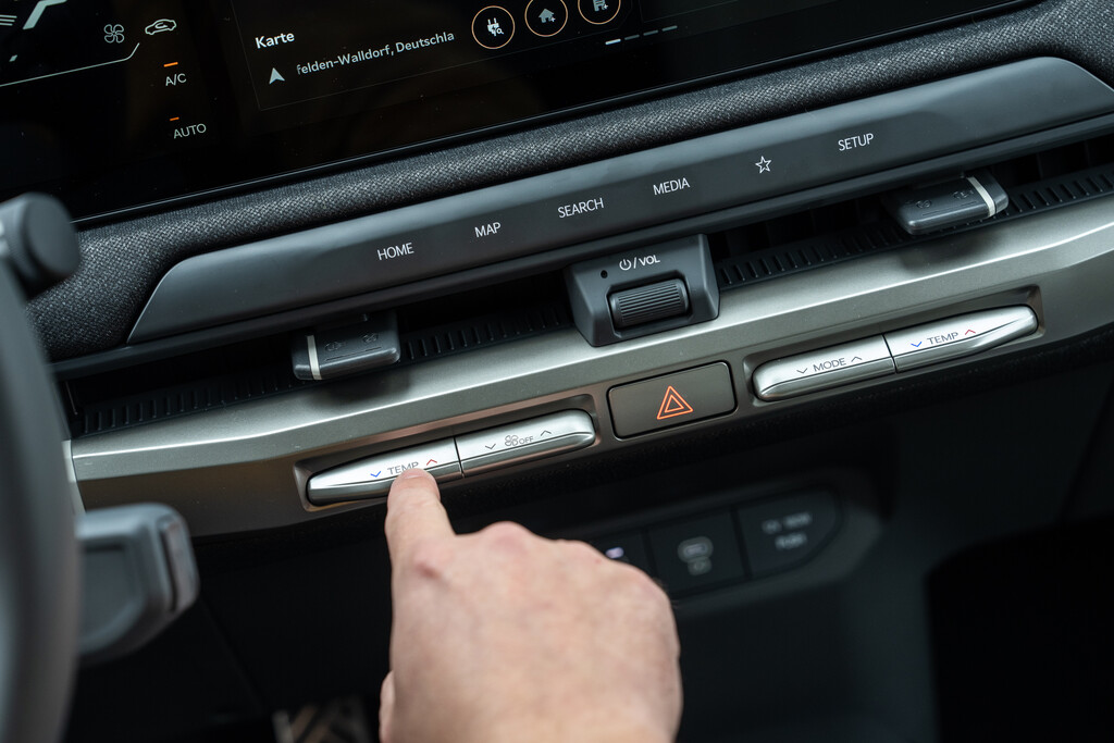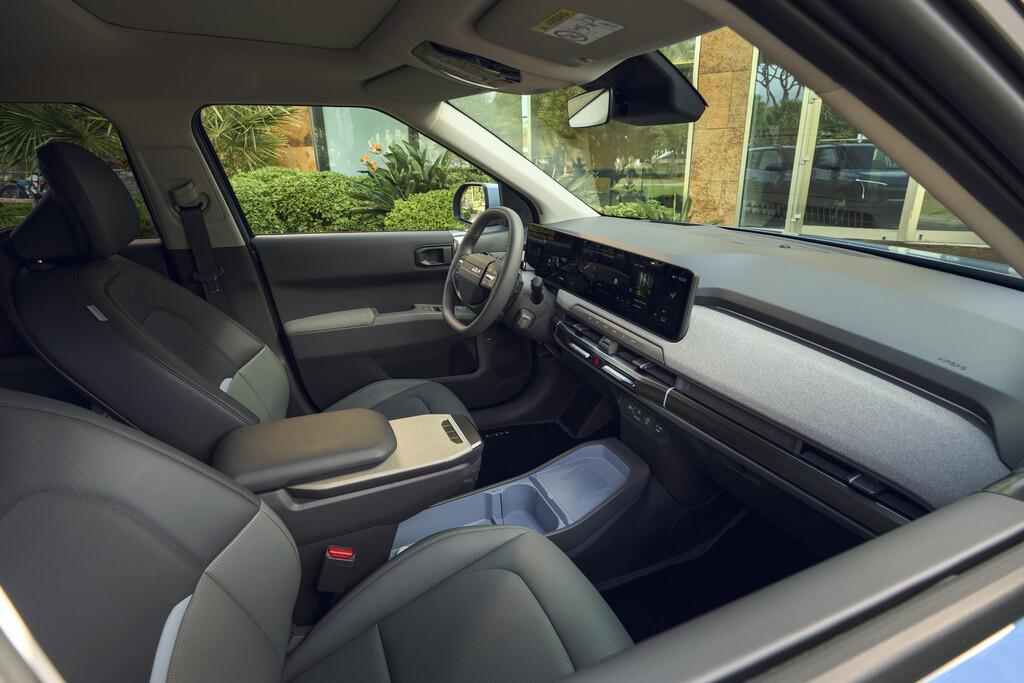 Das klingt jetzt nach Lobhudelei, doch der EV 3 – mit 4,30 Meter in der Golf-Klasse unterwegs – steht für ein angenehm nutzbares Elektroauto, das auf überflüssige technische Effekte verzichtet und den Nutzer einfach mitnimmt. Das Design ist wie gewohnt sachlich, und passt sich in die Formensprache der Marke ein. Auf den ersten Blick gibt sich der EV 3 als Kia zu erkennen, und die Mischung aus Kanten, Linien und Rundungen überzeugte offensichtlich auch die Juroren der Red Dot-Auszeichnung. Im Innenraum setzt sich die Sachlichkeit der Karosserie fort. Die Materialien machen einen wertigen Eindruck und sind gut verarbeitet. Dass sich knapp 30 Kilogramm wiederaufbereitete Materialien im Innenraum verteilen, fällt auch dem kritischsten Blick nicht auf.