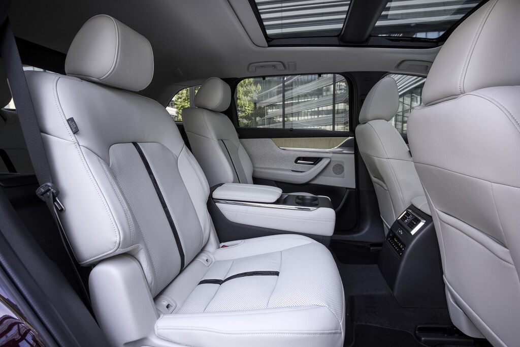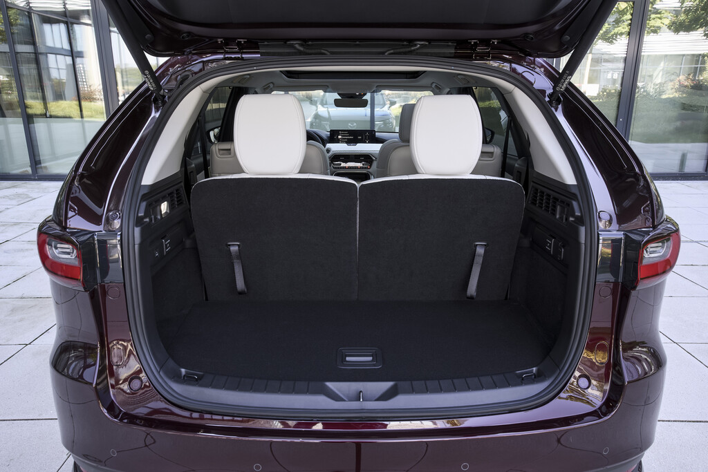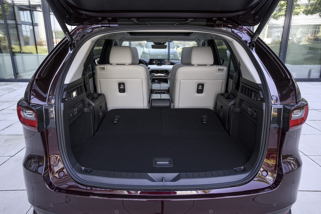 Der CX-80 bietet serienmäßig Platz für sieben Personen. Während in den ersten beiden Reihen reichlich Bewegungsfreiheit geboten wird, ist das Platzangebot in der dritten Reihe nur für Personen um die 1,70 Meter geeignet. Bei voller Bestuhlung schrumpft das Gepäckabteil zudem auf 258 Liter. Als Fünfsitzer sind es dagegen ordentliche 687 Liter. Werden die Sitzlehnen der dreigeteilten mittleren Rückbank umgeklappt, stehen 1971 Liter bis unters Dach zur Verfügung. Für einen höheren Komfort ist der Mazda CX-80 alternativ auch mit zwei belüfteten Einzelsitzen in der zweiten Reihe erhältlich. Die so genannten Captain Seats umfassen zudem eine separate Mittelkonsole.