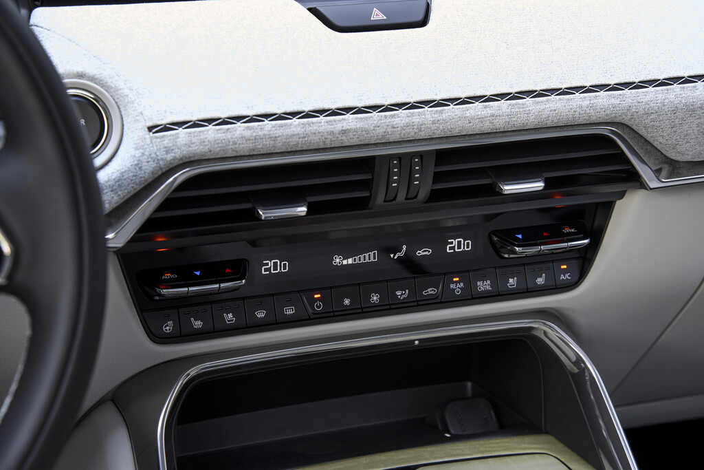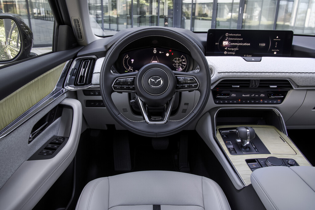 In seinen Innenraum überzeugt der Mazda CX-80 mit hochwertigen Materialien und einer sorgfältigen Verarbeitung. Die vielen aufgeschäumten Flächen rund ums Cockpit schmeicheln gleichzeitig Augen und Händen. Wer sich für die Topausstattung Takumi Plus entscheidet, wie bei unserem Testwagen, erhält für 70.250 Euro den reinsten Luxus. Diese umfasst unter anderem weiches Nappaleder mit belüfteten und beheizbaren Sitzen vorne, Echtholz-Akzenten auf der Mittelkonsole und an den Türverkleidungen sowie ein beeindruckendes Bose-Soundsystem mit zwölf Lautsprechern sowie viele weitere Details.