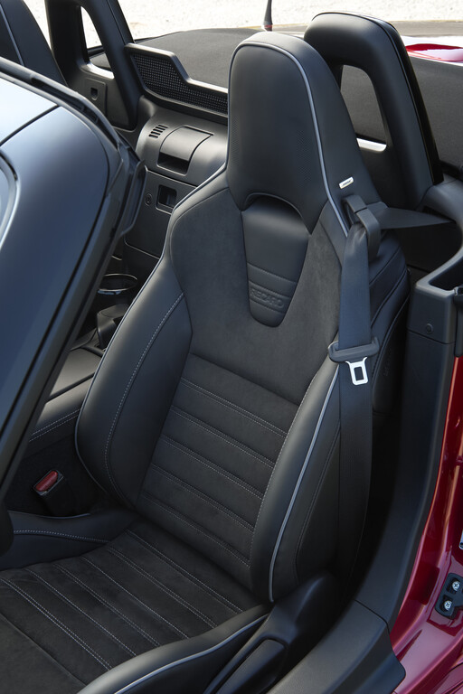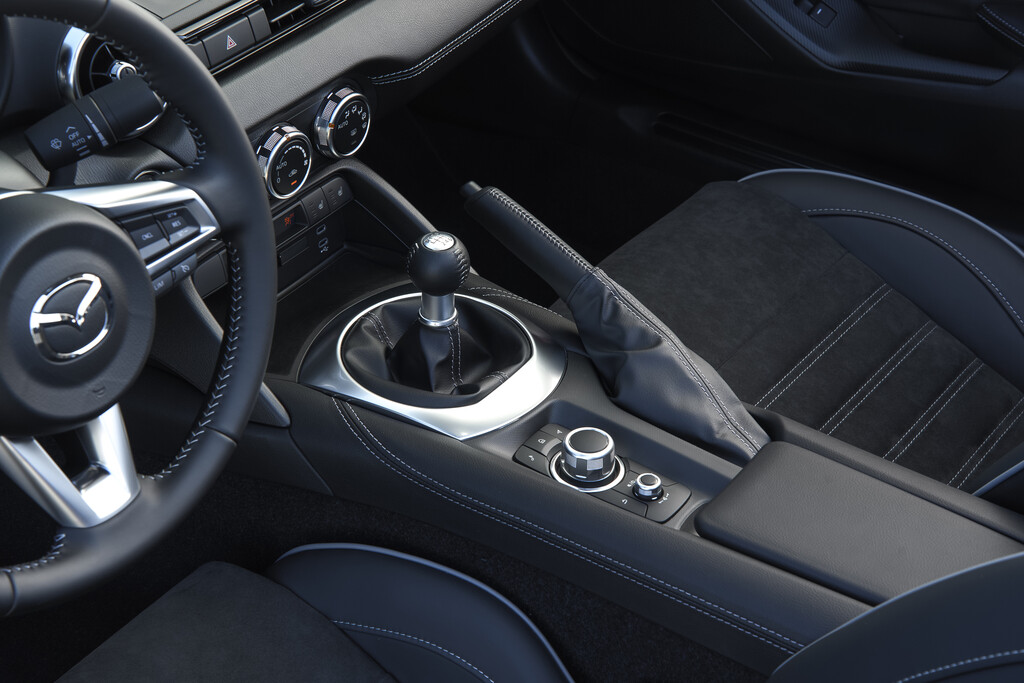 Als Tribut an die Gegenwart hilft ein 8,8 Zoll großes Touchdisplay bei den verschiedenen Einstellungen. Allerdings ist der Monitor nur im Stand bedienbar. Während der Fahrt kommt ein Dreh-Drück-Steller zum Einsatz, um durch die verschiedenen Menüs zu manövrieren. Außerdem kommt der MX-5 mit zwei USB-C-Anschlüssen sowie den kabellos nutzbaren Apple Carplay und Android Auto zu den Kunden.
