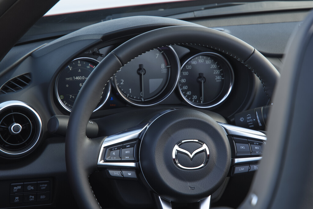 Die blumige Beschreibung trifft tatsächlich zu, denn, einmal auf den Sitz hinter dem Lenkrad eingefädelt, wird der MX-5-Pilot (und natürlich auch die Pilotin) tatsächlich Teil der Maschine. Der Sportsitz mit hervorragender Seitenführung schmiegt sich um den Fahrer, vor dem sich eine übersichtliche Informationszentrale mit einem zentral angeordneten Drehzahlmesser ausbreitet. Alle Bedienelemente sind problemlos zu erreichen. Im MX-5 ist – inzwischen eine Seltenheit – bei den Gangwechseln noch Handarbeit angesagt, doch dank des geschmeidigen Charakters der Sechs-Gang-Schaltung befördert dies das Fahrvergnügen. Der Hebel auf dem Mitteltunnel ist ergonomisch bestens platziert.