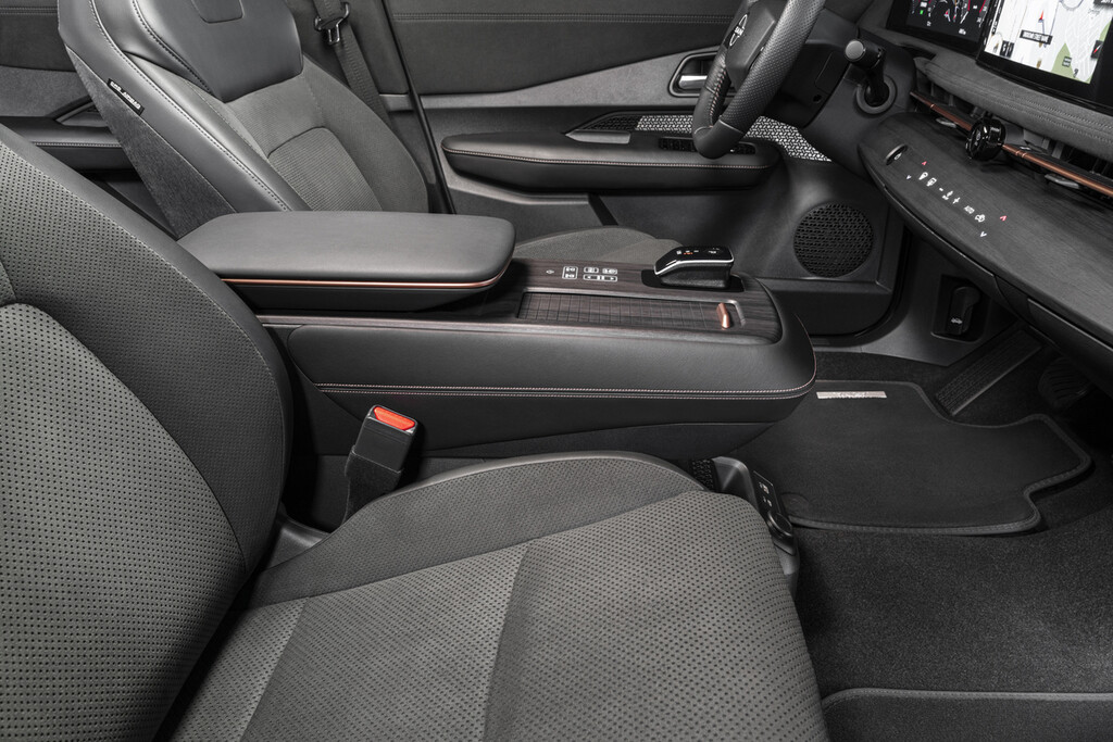Im Cockpit verzichteten die Nissan-Entwickler auf klassische Bedienelemente. Lediglich die Klimaanlage lässt sich konventionell einstellen. Wobei die Schaltflächen erst auftauchen, wenn der Ariya gestartet ist. Das Menü ist als Ausgleich für die fehlenden analogen Elemente übersichtlich strukturiert, und viele Einstellungen lassen sich mit einem freundlichen „Hallo Nissan“ steuern. Als Unterstützung, um Dienste wie Navigation und Unterhaltung zu bedienen, vertraut Nissan auf Amazons Alexa, was die Zuverlässigkeit deutlich verbessert. Echte Regler für die Laustärke und Tasten sind im Lenkrad platziert. Neben den hochwertigen Materialien kommt auch viel Hartplastik ins Spiel, um Gewicht zu sparen. Der Ariya bringt trotzdem 2259 bis 2315 Kilogramm auf die Waage.