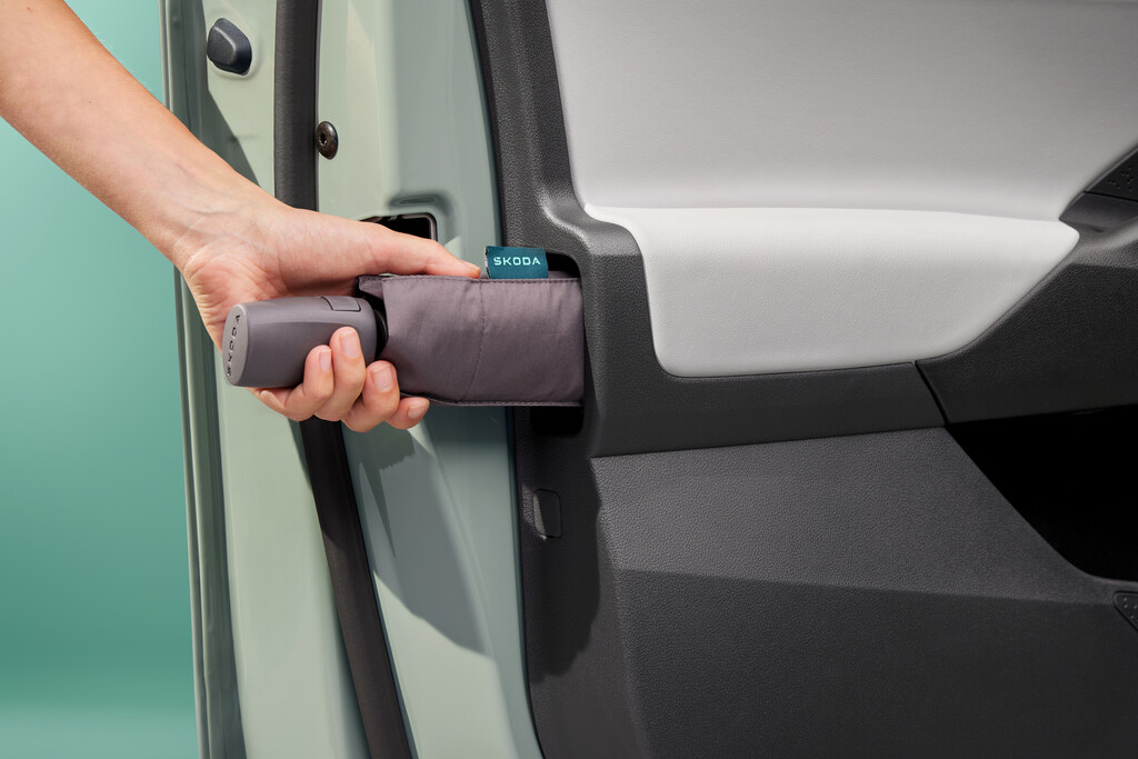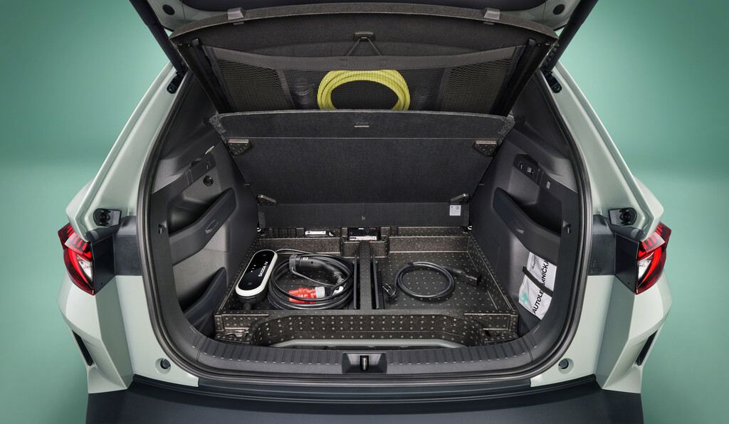 Der größte Vorteil des Elroq ist jedoch seine Geräumigkeit. Vorne sitzen auch hochgewachsene Menschen bequem, hinten bleibt bei entsprechender Einstellung noch reichlich Platz für lange Beine. Der Kofferraum fasst 470 Liter und wächst bei umgeklappten Lehnen auf bis zu 1580 Liter an. Der fehlende Frunk unter der Fronthaube wird durch ein cleveres Netz unter der Hutablage ersetzt, der das Ladekabel griffbereit hält und nerviges Suchen zwischen Wochenendeinkäufen und Gepäck verhindert. Dazu gesellen sich die markentypischen „Simply-Clever“-Spielereien wie Regenschirm, Haken und versteckte Staufächer.