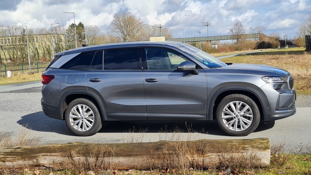 Der Kodiaq teilt sich mit dem VW Tiguan die Plattform, seine Karosserie unterscheidet sich jedoch deutlich von der Formgebung des Wolfsburger SUV. Die kantige Frontpartie fließt in die weitaus runder und harmonisch gezeichnete Silhouette und findet mit einer hinten deutlich aufsteigenden Fensterlinie in einem muskulös wirkenden Heck einen passenden Abschluss. Die Türausschnitte sind groß, das Ein und Aussteigen fällt leicht, zumal die Schweller von den Stoßleisten der Türen umschlossen werden und so die Hosenbeine auch nach Schlechtwetterfahrten sauber bleiben. Schlüssellos öffnen die Türen, der Startknopf des Motors findet sich dort, wo üblicherweise das Zündschloss an der verstellbaren Lenksäule sitzt.