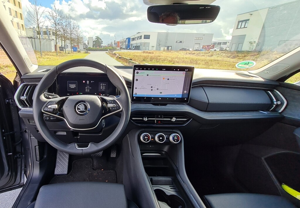 Das Cockpit ist sehr übersichtlich, die Instrumente werden auf einem Display quasi analog dargestellt und lassen sich über einen Tastendruck variabel ausrichten. Die wichtigsten Informationen sind immer im Blick, auf Wunsch werden sie um Fahrzeit und- strecke sowie den Durchschnittsverbrauch ergänzt. Erfreulich auch, dass Skoda nicht gänzlich auf die Bedienung über den 13 Zoll großen Touchscreen in der Mitte der Armaturentafel setzt, sondern für wichtige Funktionen wie die Lautstärke des Audiosystems, Temperaturwahl der Klimaanlage und der Sitzheizung auf bewährte Drehregler zurückgreift. Die rasten zwar etwas holpriger als bei der Schwestermarke VW ein, sind aber allemal die bessere Wahl als das Fingerprint hinterlassende Herumgestochere auf dem berührungssensitiven Bildschirm. Apropos Fettfinger: Aus der beliebten Reihe der einfach cleveren Skoda-Gimmicks wartet ein mikrofaserbewährtes Kunststoffstäbchen im eigenen Fach in der Mittelkonsole. Damit kann der Bildschirm mit einem Wisch wieder zum Glänzen gebracht werden.