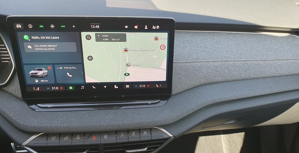 Anders im Innenraum. Der Octavia ist digitaler geworden – und das merkt man sofort. Zwei Bildschirme sind serienmäßig, optional gibt’s sogar ein 13-Zoll-Display, das mit flotter Reaktion, gutem Aufbau und brauchbarer Sprachbedienung glänzt. Aber auch: viel Ablenkung, wenn man schnell mal etwas ändern möchte. Zum Beispiel die Temperatur. Wer das ohne den Sprachassistenten („Hallo, Laura“) regeln will, fingert sich durch Menüs oder nutzt unbeleuchtete Touch-Leisten. Immerhin: Die wichtigsten Funktionen sind fix im unteren Displaybereich verankert – ein Entgegenkommen, aber kein Ersatz für echte Knöpfe. Skoda hat sich hier im VW-Konzernregal bedient und damit ein Stück Bedienlogik geopfert.