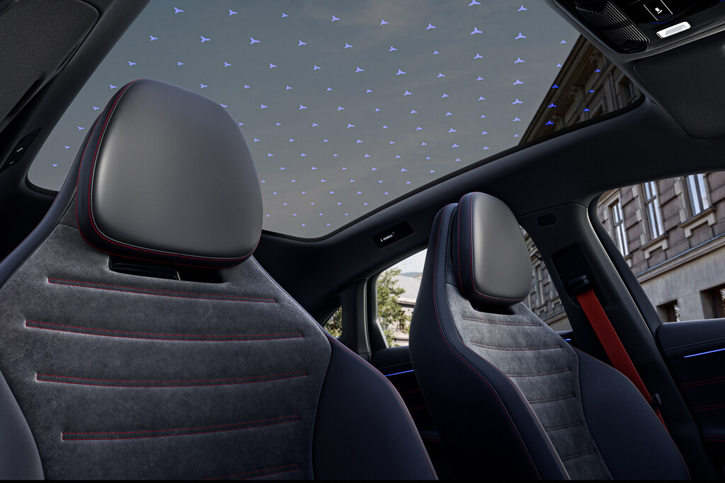 Nicht nur das Außendesign nimmt Anleihen an den größeren Modellen, auch der Innenraum ist entsprechend gestaltet und dank eines um knapp zehn Zentimeter gewachsenen Radstands deutlich großzügiger dimensioniert. Das serienmäßige Panoramadach verbessert zudem die Kopffreiheit vorne und hinten und gegen Aufpreis lässt sich der Lichteinfall auf die individuellen Ansprüche einstellen. Zusammen mit der Ambientebeleuchtung erstrahlen nachts bei Bedarf 162 Sterne über den Insassen. Wie beim EQS erstreckt sich der (optionale) 99,3 Zentimeter messende Hyperscreen über die gesamte Breite des Innenraums. Gleichzeitig erleichtern analoge Schalter die Bedienung.